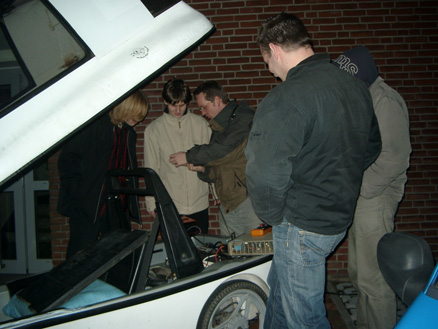 Nachdem unser roter Flitzer an den Vorbesitzer zurück gegeben wurde, erwarb das Sunny-Cani-Team vor einiger Zeit günstig ein weißes City-EL, das Matthias Rottmann und Julian Kneifel aus der Jgst. 13 mit einem Pferde-Anhänger aus Hagen abholten. Da es durch Vandalismus stark zerstört war und daher aufgearbeitet werden musste, machten sich Lukas Nacke und Fabian Pellmann aus der 9b an die Arbeit, flickten die Löcher in der Haube und unterzogen es einer gründlichen Reinigung von innen und von außen. Technische Reparaturen wurden von unserer Sponsor-Firma Autohaus Rüschkamp durchgeführt. Nachdem gestern ein neuer Powerlader eingebaut worden war, ist das Cani-Mobil nun wieder „auf Fahrt“. Die erste Bewährungsprobe wird die Beteiligung am E-Mobil-Cup in Recklinghausen sein, im Sommer steht die 16. ECO-Tour de Ruhr auf dem Programm. Übrigens können alle Cani-Schüler ab 16 Jahren auf unserem City-EL bei der Fahrschule Rüschkamp den Führerschein für Leichtkraftfahrzeuge erwerben.