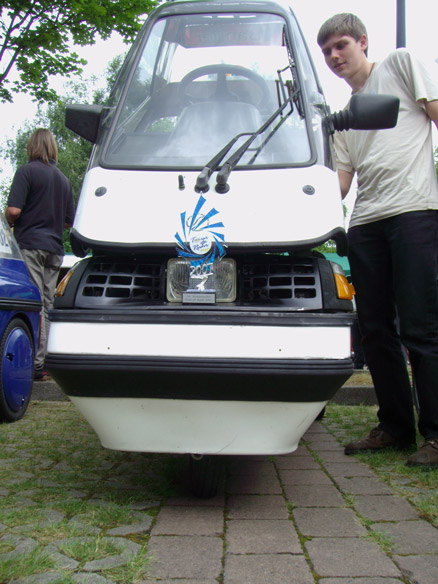 Zwischen Rennen und Siegerehrung kamen wir ins Gespräch mit Olaf Regge, Webmaster der Freunde der Elektrofahrzeuge im Kreis Münsterland (www.fekm.de.ms), der sich anbot, uns in den Ferien bei der Reparatur der in Teilen gesplitterten Haube mit Glasfasermatten zu helfen. Auch für Holger Keser waren es erfolgreiche Tage, da er einige neue Standorte für das Drehstromnetz gefunden hat.