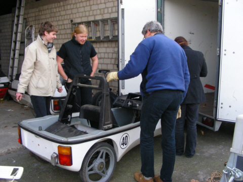 Samstagmorgen, gegen 9.30Uhr, holte Lehrer Bernd Lieneweg aus Senden die Schüler Lukas Nacke und Fabian Pellamnn aus dem Westfälischen Olfen an der Stever ab, es ging in Richtung Recklinghausen, um dort Cani-Lehrer Dr. Georg Schütz einzusammeln. Gemeinsam fuhren wir mit dem von Fa. Rüschkamp gestellten PickUp samt Anhänger-Gespann nach Schwelm, um dort am ersten Punkt unserer Tour ein Ur-EL, ein City-El der ersten Bauart, und ein elektrisches Mofa aus den 70-er Jahren zu erstehen. Darauf ging es über Wuppertal, wo wir Zwischenstopp machten, um einige Ersatzteile abzuholen, weiter nach Euskirchen, wo wir ein weiteres EL, diesmal aus neuerer Baureihe, sowie etliche Ersatz- und Kleinteile abholten. Am darauf folgenden Sonntag, den 01.02.09 traf sich das alte Sunny-Cani-Team mit seinen neuen Mitgliedern zum gemeinsamen Frühstück mit Lagebesprechung.