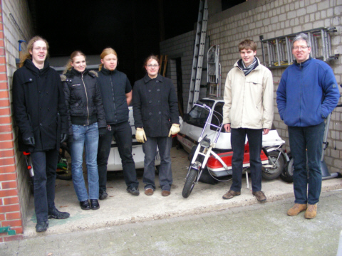 Als nach dem Essen Bernd Lieneweg mit dem Gespann auf dem Hof der Familie Nacke in einer Olfener Bauerschaft („auf Kökelsum“) ankam, wurde abgeladen und die vor uns stehende Arbeit begutachtet. Für die Treffen der AG wurde ausgemacht, dass sich ab dem 14.02.09 – im Hinblick auf besseres und vor allem wärmeres Wetter – in regelmäßigen Abständen getroffen wird, um die Restaurierung der Fahrzeuge durchzuführen. Ziel ist es, dass mindestens eines der beiden City-ELs und das Mofa bis zur Solar-Challange-Münsterland 2009 am ersten Maiwochenende fahrtüchtig sind.