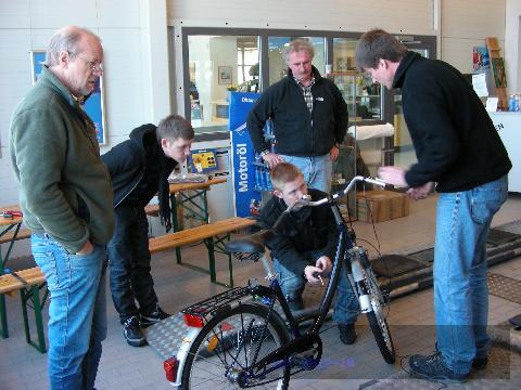Beim 3. E-Treff am vergangenen Samstag in der Werkstatt des Autohauses Rüschkamp an der Seppenrader Straße lernten vormittags die Schüler der Fahrrad-AG Senden, Dennis Bauer und Christoph Ignatzy, zusammen mit ihrem Lehrer Hermann Wulfekammer unter Anleitung von Dipl. Ing Martin Behrs vom Netzwerk ruhrmobil-E Bochum, wie man gebrauchte Fahrräder zu Pedelecs, also Elektrofahrrädern, umrüstet. Sie möchten ihre neuen Kenntnisse beim Leezentag von ADFC und Autohaus Rüschkamp am 20. März weitergeben, indem sie Leuten helfen wollen, die ihr eigenes Fahrrad mit einem Umrüstkit zum Pedelec umbauen möchten.