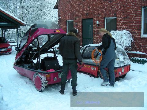 Lüdinghausen. Das Sunny-Cani-Team Lüdinghausen und das EL-Team Münsterland hatten am vergangenen Samstag zu einem vorweihnachtlichen Stammtisch für Elektrofahrer, zum letzten E-Treff Münsterland in diesem Jahr, eingeladen. Lukas Nacke und Fabian Pellmann hatten zu diesem Zweck die Team-eigene Werkstatt auf Vordermann gebracht, die sie vorher mit ausrangierten Schulmöbeln vom Cani so möbliert hatten, dass das Werkzeug nun griffbereit und staubfrei gelagert ist. Für die Stammtisch-Gäste wurden Tische und Stühle aufgestellt, zu Kaffee und kalten Getränken gab es frischen Stollen und Weihnachtsgebäck. Gesprächsthemen waren wieder einmal die Technik alter und neuer Elektrofahrzeuge, Erfahrungen mit den verschiedenen Batteriesystemen, dazu kamen aktuelle Erlebnisse bei Eis und Schnee und das Verhalten der dreirädrigen Leichtkraftfahrzeuge bei den derzeitigen Straßenverhältnissen. Während die meisten Elektromobilisten in großen Verbrenner-Limousinen und Campingbussen angereist waren, war es für Ludger Bentlage aus Ascheberg ein Anliegen zu zeigen, dass man mit der richtigen Ausstattung auch mit einem elektrisch betriebenen Kabinenroller im strengen Winter sein Ziel erreichen kann. Getreu dem Motto „Einer kam durch“ hatte er sein CityEL mit weniger Kälte-empfindlichen Batterien und speziellen Winterreifen ausgestattet und sich selbst mit wärmender Unterwäsche und dicker Lederbekleidung und Mütze ausstaffiert. Denn die kleine Defrosterheizung für die Windschutzscheibe wärmt nicht wirklich, außerdem will man den Strom nicht für Heizzwecke verschwenden, zumal der erhöhte Rollwiderstand der Winterreifen im Schnee sich schon spürbar als „Stromfresser“ bemerkbar macht. Und eine nachrüstbare Benzinheizung mit Auspuff kommt für Ludger Bentlage in einem Elektroauto nicht infrage.