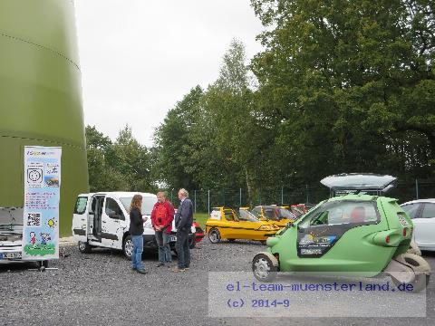 Erstaunlich viele CityELs, Twikes und Sams waren gekommen, die modernen Autos der Großserienhersteller waren durch Nissan, Mitsubishi, Peugeot, Renault, Smart, Opel und VW vertreten. Die ISOR steuerte mehrere ältere und neuere fahrzeuge bei. Wie immer in letzter Zeit war der Tesla Model S aus den Reihen der ISOR aber der eigentliche Hingucker. Daneben gab es Haustechnik, Pedelecs und Ladestationen zu sehen, auch die Energieagentur NRW war mit einem großen Infostand vertreten. Als dann nachmittags auch noch die Sonne die schier unendliche Zahl von Solarzellen entdeckt hatte, strömten die Interessierten massenhaft in den berühmten Bioenergiepark der kleinen, energieautarken Gemeinde Saerbeck im nördlichen Münsterland.