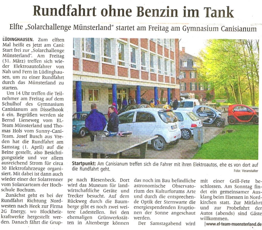 Um 14 Uhr treffen die Teilnehmer am Freitag auf dem Schulhof des Gymnasium Canisianum am Disselhook 6 ein. Begrüßen werden sie Bernd Lieneweg vom EL-Team Münsterland und Thomas Hols vom Sunny-Cani-Team. Josef Busch aus Vreden hat die Rundfahrt am Samstag (1. April) auf die Beine gestellt, also Besichtigungsziele und vor allem ausreichend Strom für circa 30 Elektrofahrzeuge organisiert. Mit dabei ist dann auch wieder einer der Solarrenner vom Solarcarteam der Hochschule Bochum.